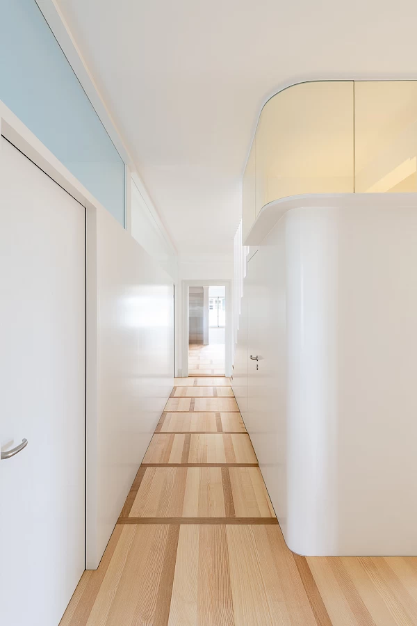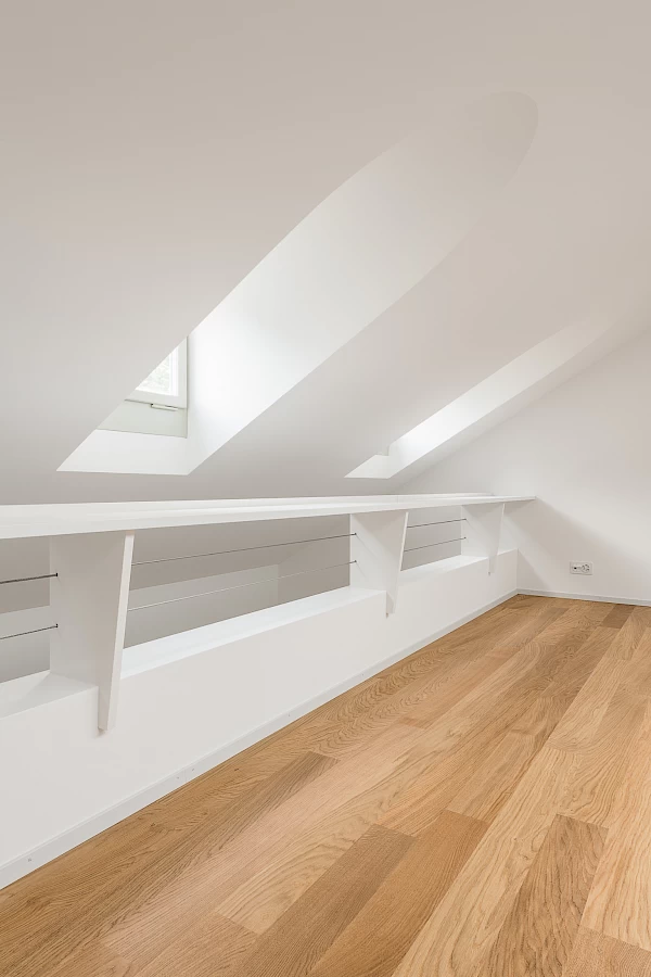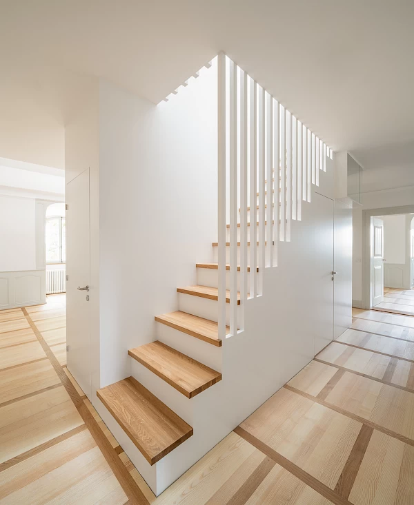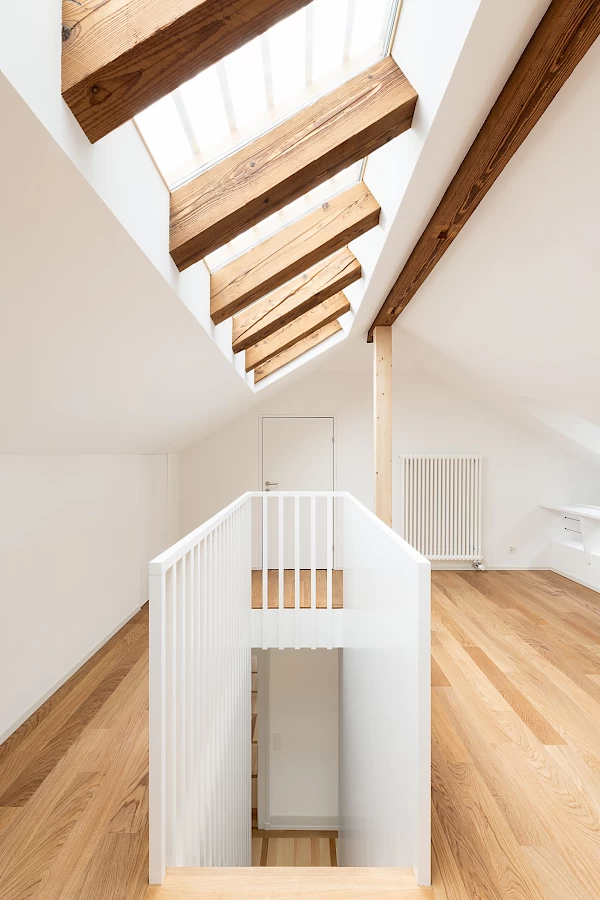 Der Umbau der Grosswohnung in zwei Einheiten erforderte im östlichen Anbau umfassende Eingriffe von Dach bis Untergeschoss. Dabei mussten Stabilitäts- und Erhaltungsziele sorgfältig abgestimmt werden. Unter denkmalpflegerischer Leitung entstanden zwei neue Sandsteinlukarnen gegen Westen, während intakte nördliche Lukarnen erhalten und südliche ersetzt wurden. Die Dachsanierung ermöglichte ein neues Lichtband gegen Norden und drei Gauben gegen Süden für mehr Licht im Obergeschoss. Schall- und Wärmeschutz führten zu neuen Bodenaufbauten mit neuen Eichen- und Eschenböden. Im Erdgeschoss wurden Einbauten schonend integriert, im Untergeschoss die Technik erneuert und die Kellerdecke gedämmt. Die kontinuierliche Begleitung des Umbaus von der Machbarkeitsstudie bis zur Schlüsselübergabe durch die Architekten war für das Gelingen der Aufgabe ebenso wichtig, wie das grosse Engagement der Unternehmungen und deren Handwerkskunst.