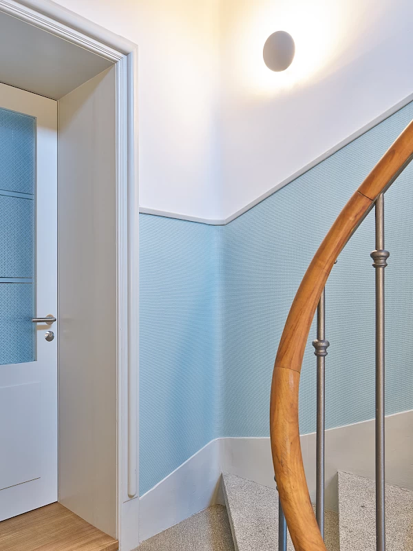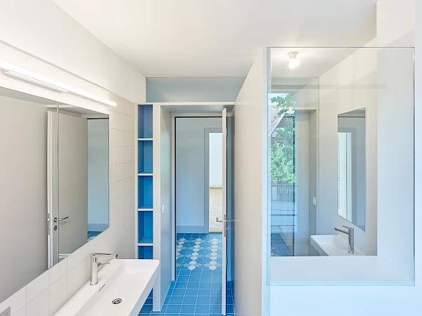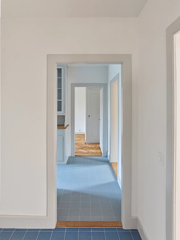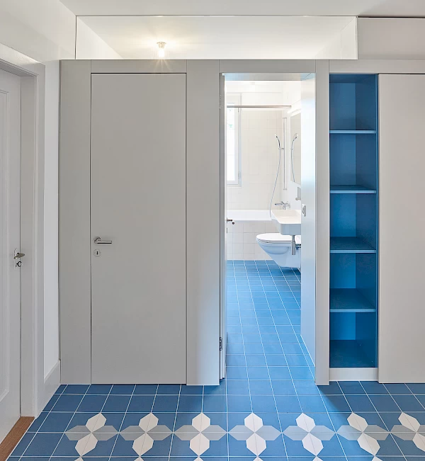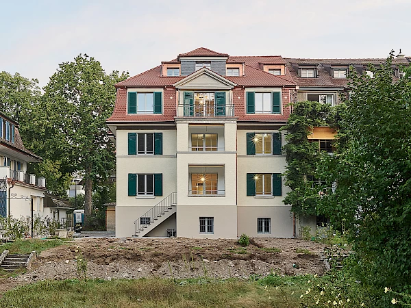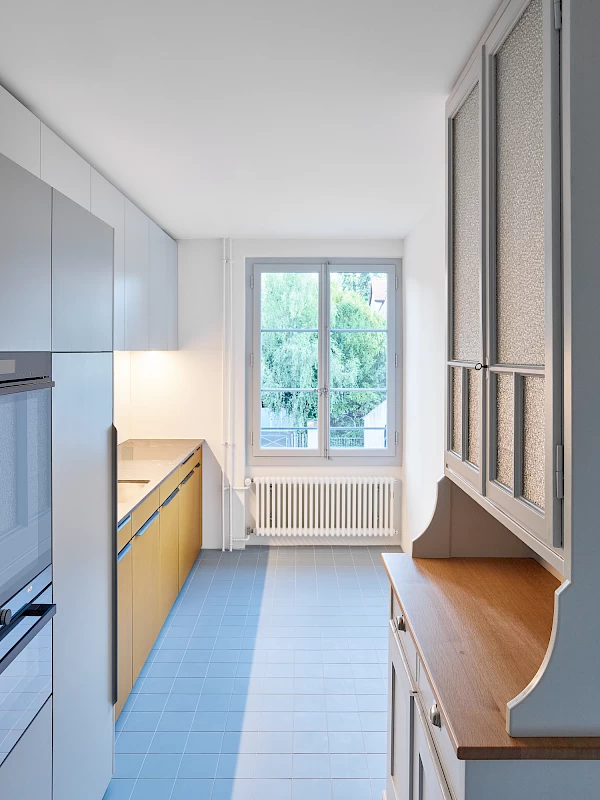 Ziel war es die vorhandenen Qualitäten zu stärken und eine ressourcenschonende Anpassung an heutige Bedürfnisse zu erreichen. Die besondere Charakteristik der Raumstruktur des Hauses ist der Aufbau aus drei verschiedenen Raumschichten – im Kern das Treppenhaus, im Kranz darum angelagert die dienenden Räume jeder Wohnung - Entrée, Küche und Nasszellen - und dreiseitig daran angedokt die Zimmer. Kleine Veränderungen lassen die Raumfolgen grosszügiger erscheinen, leiten Tageslicht bis in den Kern des Hauses und neue Bodenbeläge machen die Raumschichtung von Innen nach Aussen besser ablesbar.