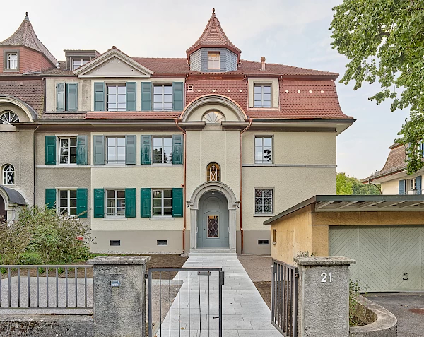 Sieben Reihenmietshäuser in der oberen Jubiläumsstrasse wurden 1921 vom Architekten Friedrich Studer Sohn im vom Heimatstil geprägten Neobarock erbaut und sind als erhaltenswerte „K-Objekte“ im Bauinventar der Stadt Bern aufgeführt. Das Haus Nr. 21 ist das südliche Endhaus der Reihe und verfügt pro Geschoss über eine grosszügige 5-Zimmerwohnung. Der tiefe rückseitige Garten mit Aussicht auf den Dählhölzliwald und die wohl proportionierten, gut belichteten und nutzungsneutralen Räume haben grosse Qualität. Im Gegensatz dazu waren die dienenden Räume und das Treppenhaus beengt.