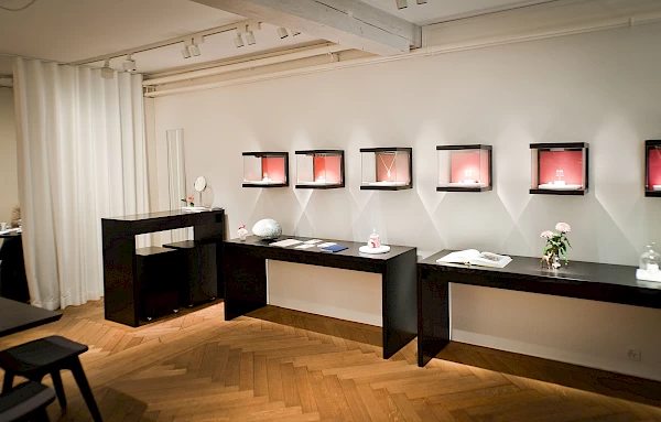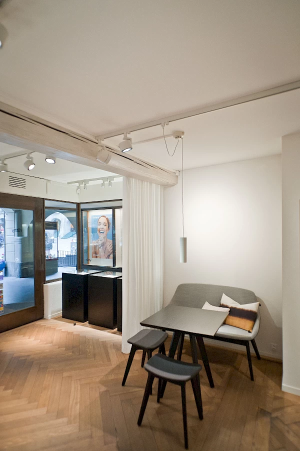 Mit gezielten Eingriffen wurde der kleine Kundenbereich optimal unterteilt; Pausentisch und Büronische haben ebenso ihren Platz gefunden wie der Kassenbereich, der Beratungstisch und die schönen, neuen Vitrinen.
