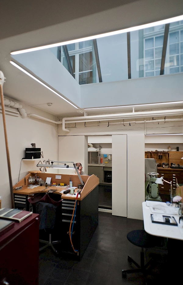 Zwischen dem Kundenbereich und den Atelierplätzen trennt ein schlichtes Einbaumöbel die zwei Welten. Das Atelier wirkt dank dem bereits bestehenden Oblicht und der neuen Aufteilung sehr hell und einladend. Auch in der Werkstatt konnte dank kleinen Eingriffen vieles optimiert und erneuert werden.