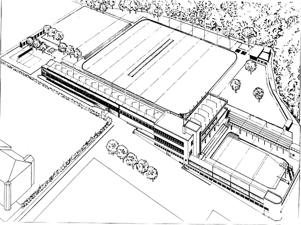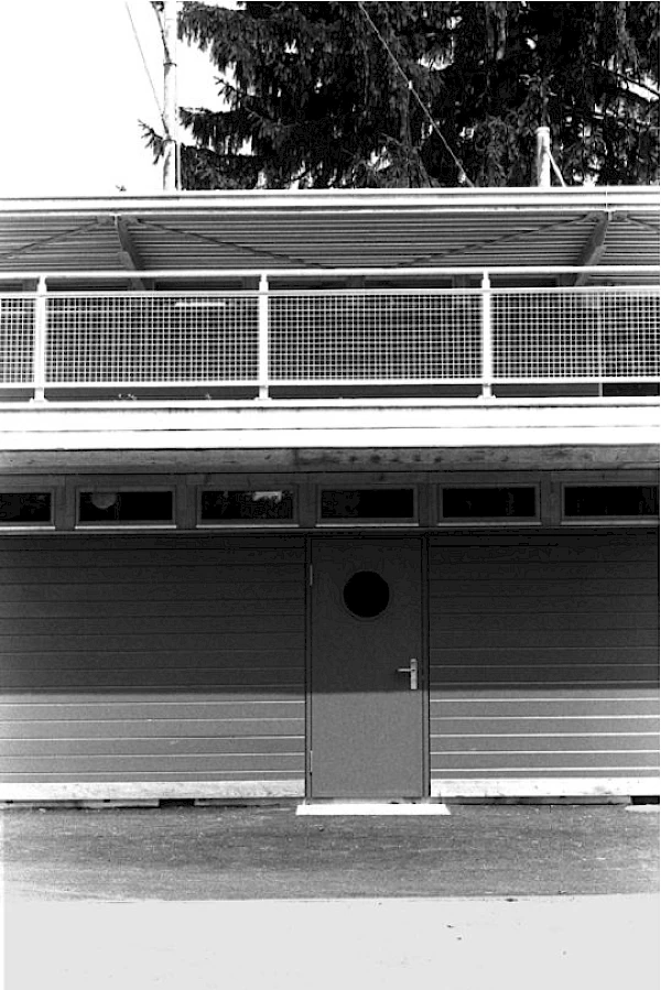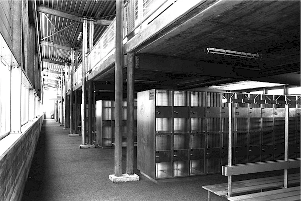 In der Publikumsgarderobe sind zusätzlich Lagerräume, Vereins- und Schiedsrichtergarderoben, Werkstatt und Garage untergebracht. Die Liegeterrasse im 1.OG hilft das Freiflächenmanko der Ka-We-De zu verringern.