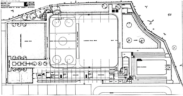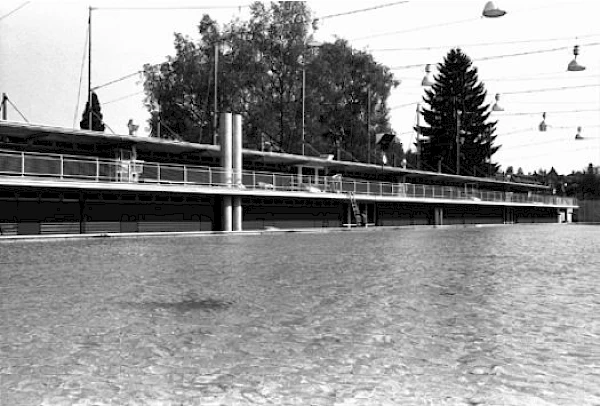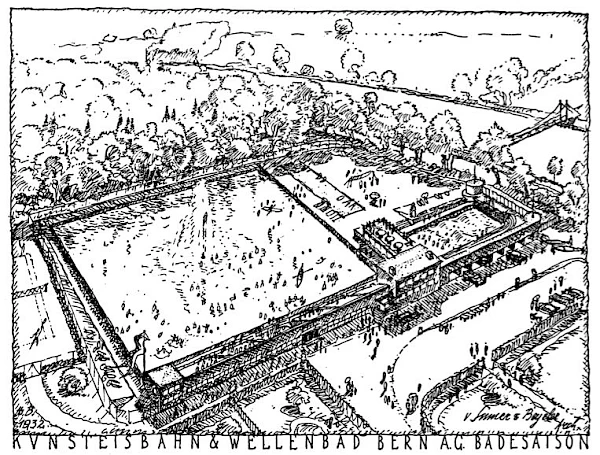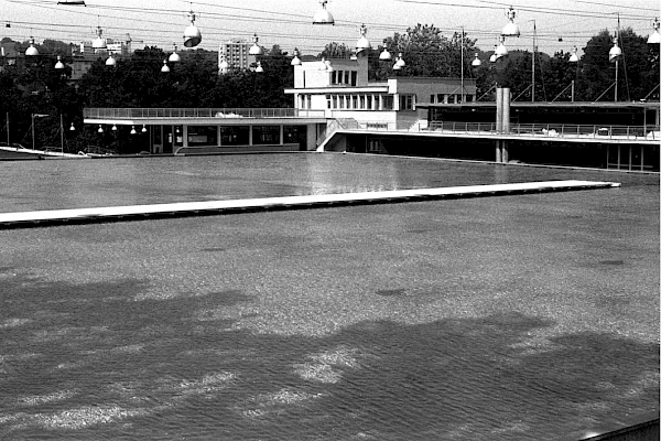 Schwierigkeiten verursachte die Forderung nach einem getrennten Hockeyfeld. Aus diesem Grund wurden die beiden Eisflächen so nebeneinander angeordnet, dass sie im Sommer zu einem grossen Wasserbecken verbunden werden können. Der trennende Teil wird im Sommer mittels Betonelementen zum Riesenfloss mitten im Wasser, umfunktioniert. Diese Lösung stellt im Grunde genommen eine an die heutigen Anforderungen angepasste Rekonstruktion des alten Planschbeckens dar.