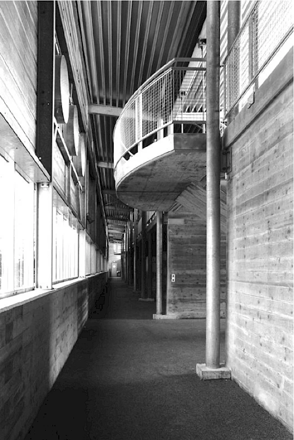Im Innenausbau wurde auf Verkleidungen und Oberflächenbehandlungen weitgehend verzichtet.