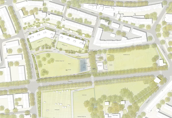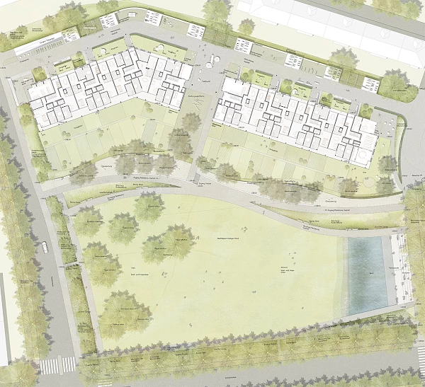 Unser Wettbewerbsprojekt sieht vor die bestehende nördliche Bebauungsstruktur mit einer Hauszeile zu ergänzen, die nach Süden zum neuen Stadtteilpark hin ausgerichtet ist. Zwischen der neuen Bebauung und dem bestehenden Quartier wird eine autofreie Wohn- und Spielstrasse geschaffen, welche an des bestehende Netz der Quartierstrassen anknüpft. Diese Spielstrasse profitiert optimal von der Abendsonne und bildet die Adresse für die neuen Wohnungen. Im Erdgeschoss sind vielfältige öffentliche Nutzungen angelegt. Gemeinschaftlich genutzte Räume, eine Ludothek und ein Velo-Repair-Café beleben den Ort.