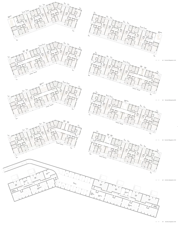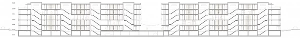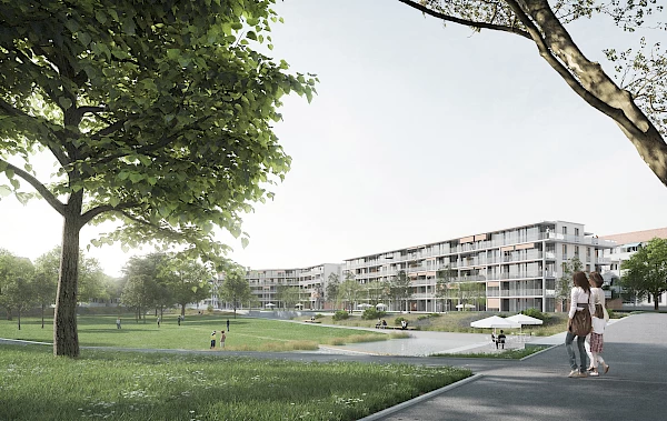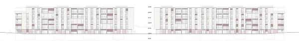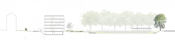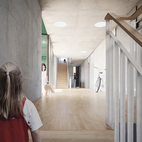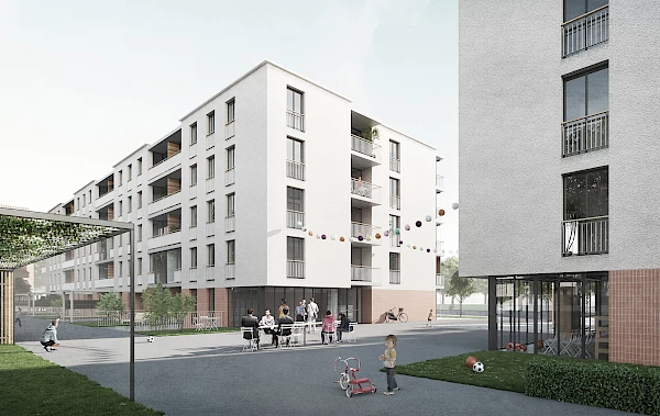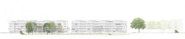 Die parkseitige Fassade ist offen gestaltet und mit durchgehenden Balkonen geschützt. Die räumlich transparente Schichtung schafft einen weichen Übergang zwischen Grünraum und Gebautem. Ausgehend von der bestehenden Bebauungsstruktur wird die Zeile in der Mitte geteilt. Der so entstehende Platzraum bildet den sozialen Schwerpunkt der Bebauung und dient als direkter Zugang von der Quartierstrasse zum Park.