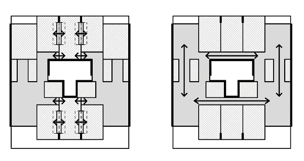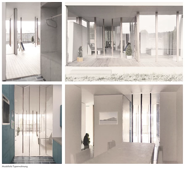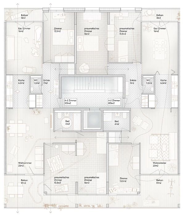 In den Wohnungen bilden die zentral gelegenen Küchen eine attraktive Mitte und ermöglichen es bei Bedarf einen zusätzlichen Individualraum einzurichten. Weitgehend nutzungsneutrale Räume mit 13-16m2 - zum Teil sogar als „chambre pneumatique“ durch die Wohnenden auf einfache Weise anpassbar – und ein flexibler Grundriss mit abtrennbarem Essbereich ermöglichen einen sehr variablen Gebrauch und hohe Wohnungsbelegungen.