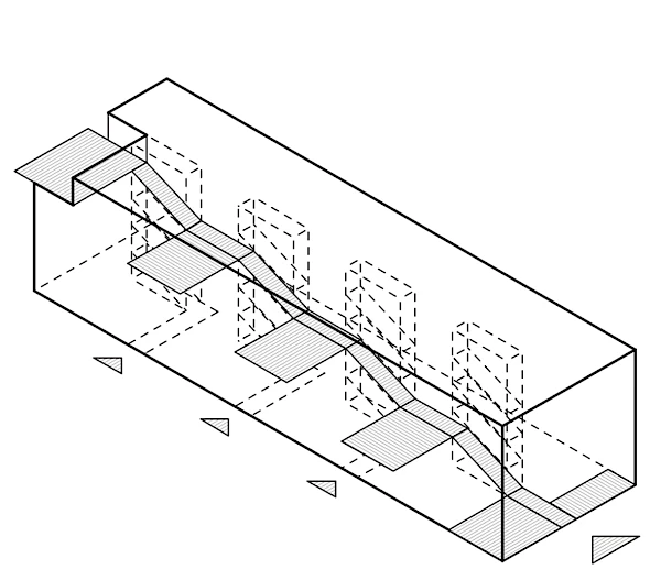 Vom Quartierplatz aus starten zwei Kaskadentreppen, welche längs durch die Häuser hindurch die Treppenhäuser miteinander verbinden und beidseits auf Dachterassen mit Gemeinschaftsküche führen. Diese inneren Kaskaden ermöglichen eine vielseitige Durchwegung der beiden Häuser und wirken als Rückgrat des sozialen Lebens. Logisch ist in jedem Haus einen Gemeinschaftsraum in der Hausmitte an dieser Kaskade angeordnet.