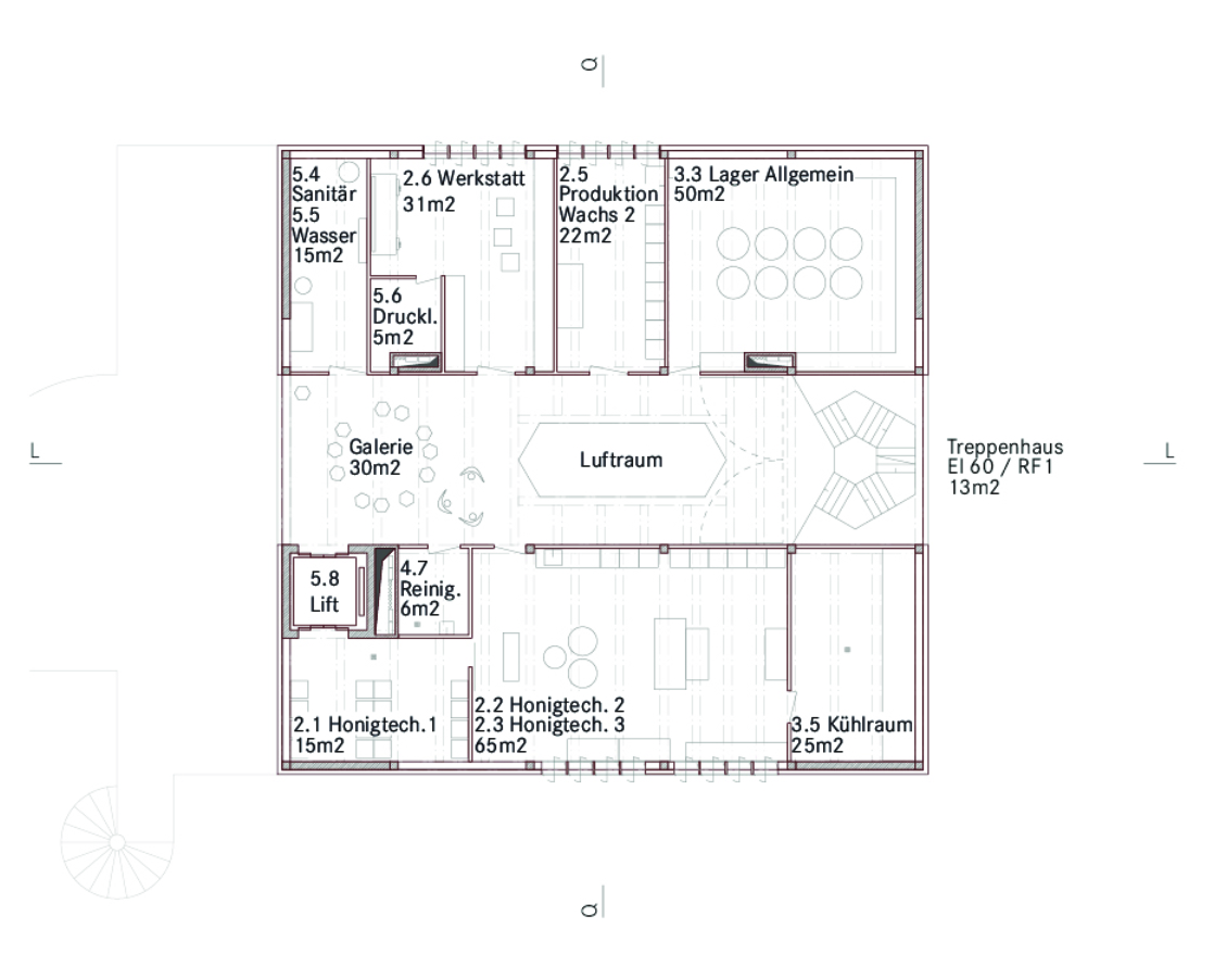 Die Architektur und Raumkomposition des Projekts evozieren Bezüge zum Bienenstock. Der aufgeständerte Holzbau besticht durch horizontale Bänder und eine Fassade aus Re-Use-Solarpaneelen hinter grünem Recyclingglas. Drehbare Kastenfenster beleben das Bild, während vertikale Biodiversitätsflächen aus Stroh den Bau kontrastreich rahmen. Hohe Räume garantieren Nutzungsflexibilität. Herzstück ist die vertikale Raumstruktur: Ein Atrium und eine Treppenanlage schaffen Begegnungsorte und machen das Haus zu einem innovativen Arbeitsplatz – funktional und ästhetisch im Einklang mit der Natur.