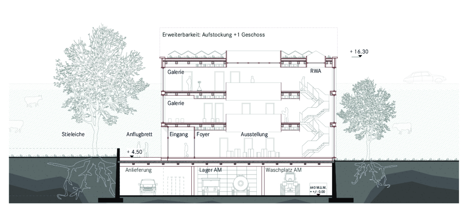 Die erdberührten Arbeiten umfassen vier Fundamente für Betonstützen, die Liftunterfahrt und einzelne Mikropfähle zur Verstärkung der bestehenden Stützmauer. Die robusten Bauteile im Erdgeschoss sind kraftschlüssig mit ihr verbunden, erfüllen das Schwingungskriterium VC-A und tragen die Holz-Beton-Verbundkonstruktion. Diese ist leicht, aufstockbar bis zur Gebäudehöhe CA und wird südlich über Brüstungsträger sowie die Decke über dem Unterstand abgefangen. Alle Verbindungen sind kreislauffähig.