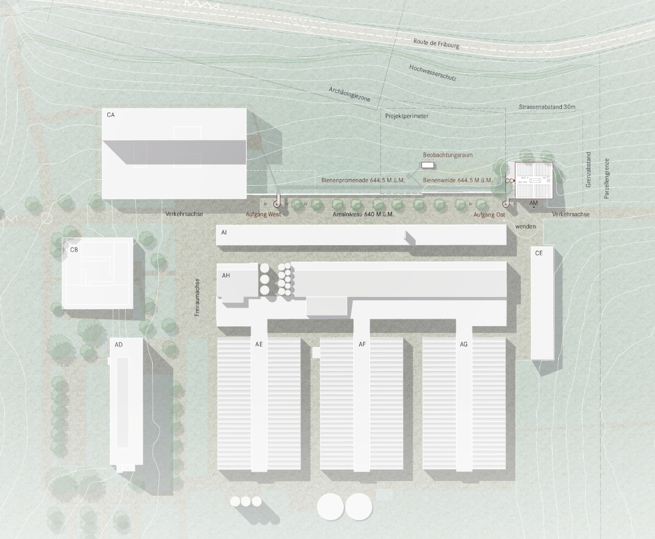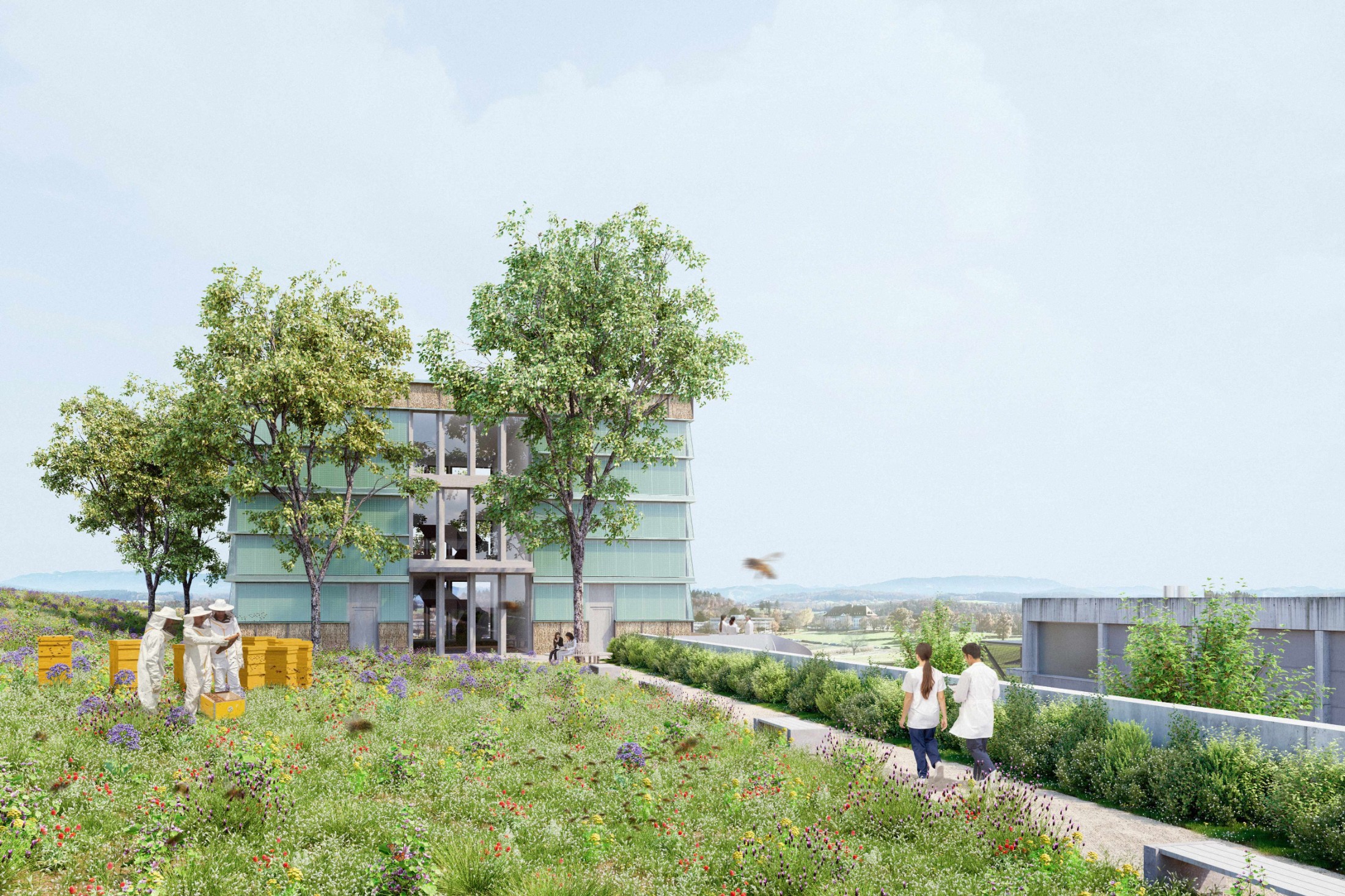 Die Schweiz verliert jährlich 3'300 ha Agrarland durch Bautätigkeit – eine Gefahr für die Versorgungssicherheit. Angesichts knapper Ressourcen sind innovative Konzepte ohne Bodenverschleiss nötig. Das vorliegende Projekt löst dies durch einen ressourcenschonenden Neubau: Das Bienenforschungszentrum wird als Aufstockung realisiert, statt auf der grünen Wiese. Durch diesen Verzicht auf zusätzlichen Bodenverbrauch der verbunden ist mit aufwändigen Erdarbeiten halbieren sich die Baukosten und reduzieren sich die Emissionen sowie die Bauzeit massiv. Ein präziser Beitrag zum Schutz unserer fruchtbaren Böden im Zeichen der Bienen.