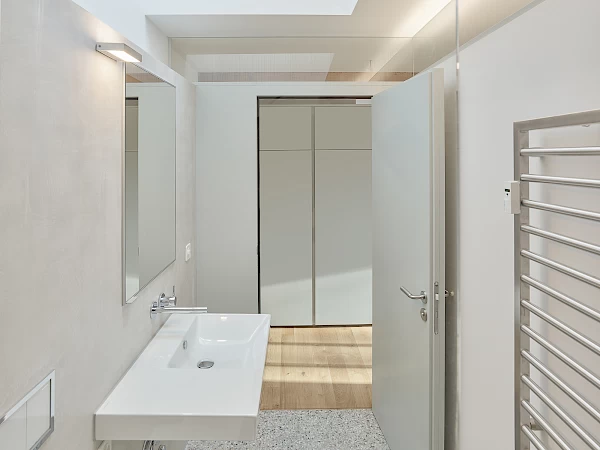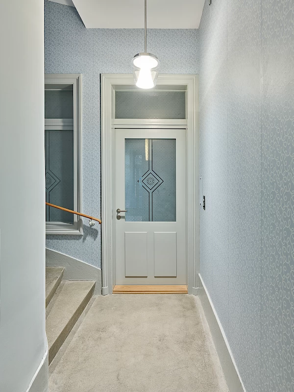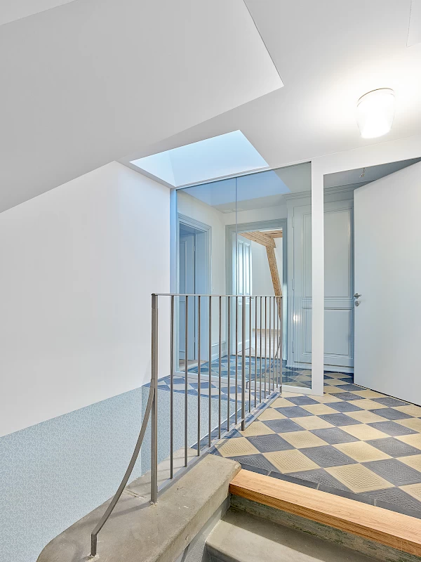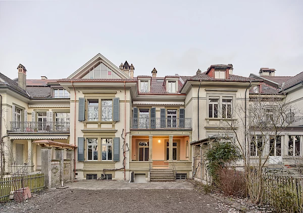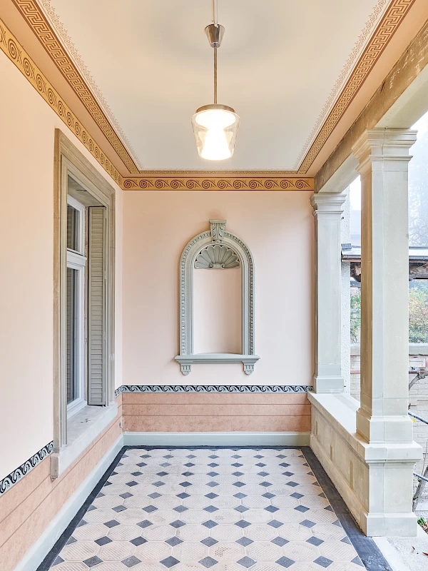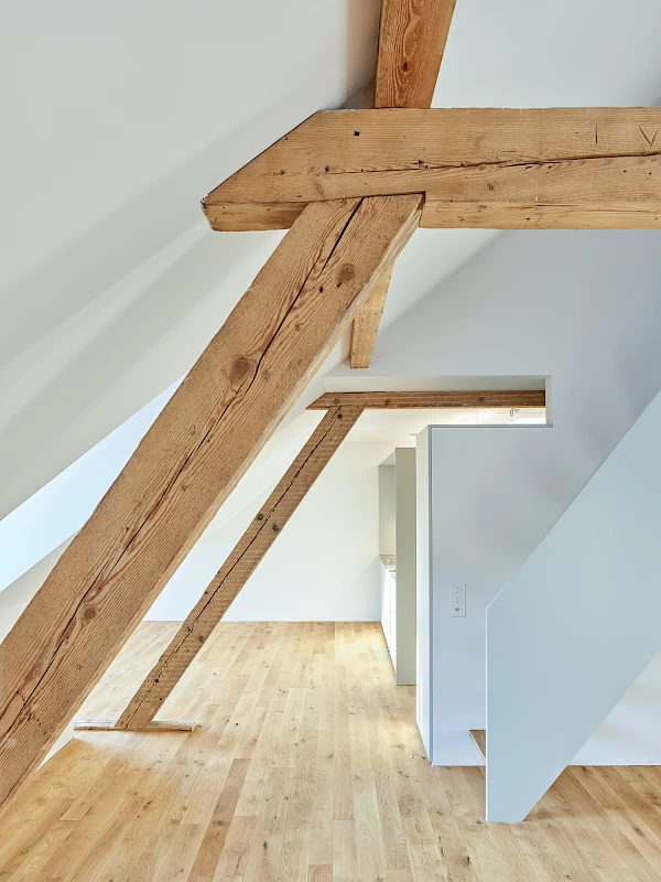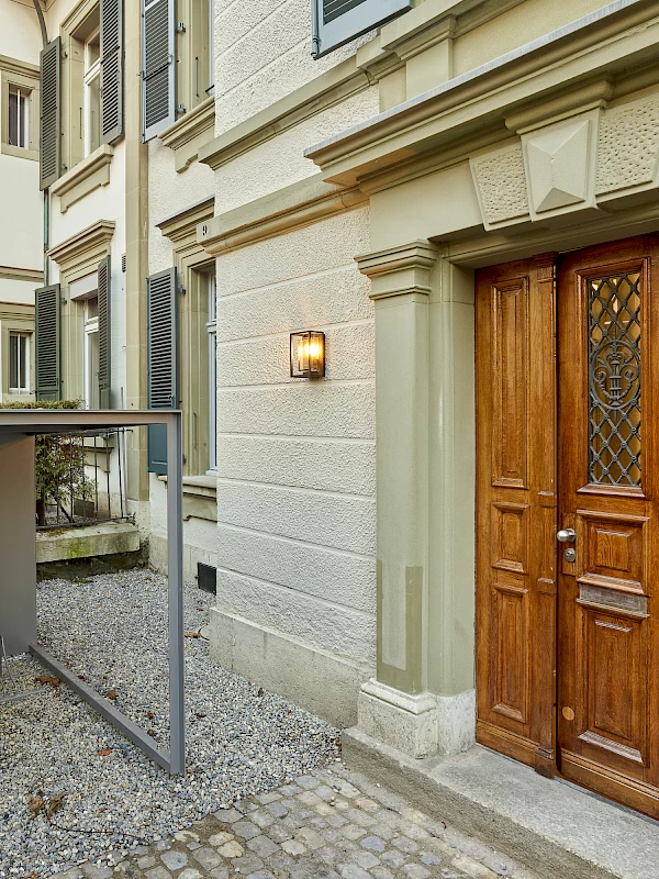 Den grössten Eingriff in die Struktur des Hauses stellte der Ausbau des Dachgeschosses dar. Eine Kombination von neu ausgebildeten Lukarnen und indirekter Belichtung durch Dachflächenfenster schafft attraktive und helle Räume. Nebst der thermischen Sanierung der Hülle stellten die gesetzlichen Auflagen betreffend Schallschutz zwischen den Einheiten eine bauliche Herausforderung dar. Die alten Parkettböden konnten aufgearbeitet und wieder eingebaut werden, so dass der Charakter der Innenräume erhalten wurde. Die restaurierten Schablonenmalereien in der Loggia im Erdgeschoss und eine Neuinterpretation der für die Bauzeit typischen Tapeten, von denen Spuren gefunden wurden, verbinden Geschichte und Gegenwart des Hauses.
