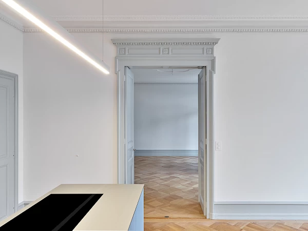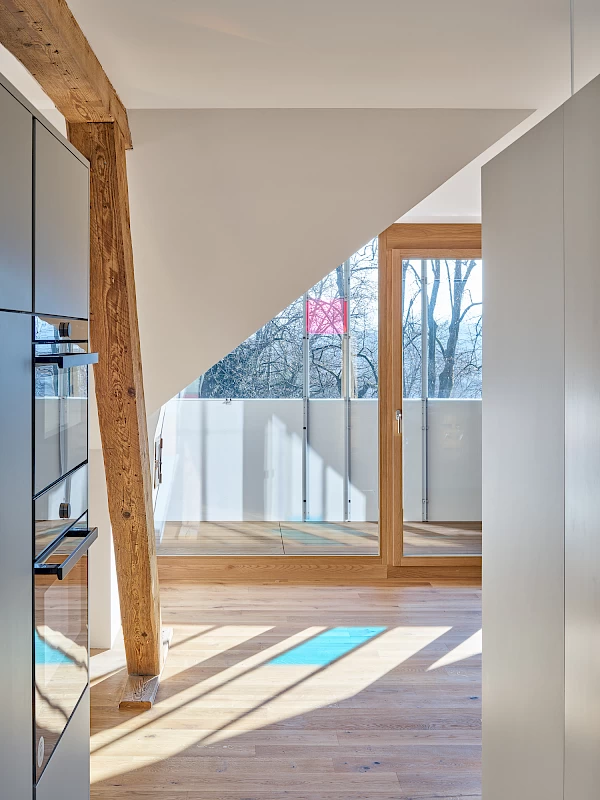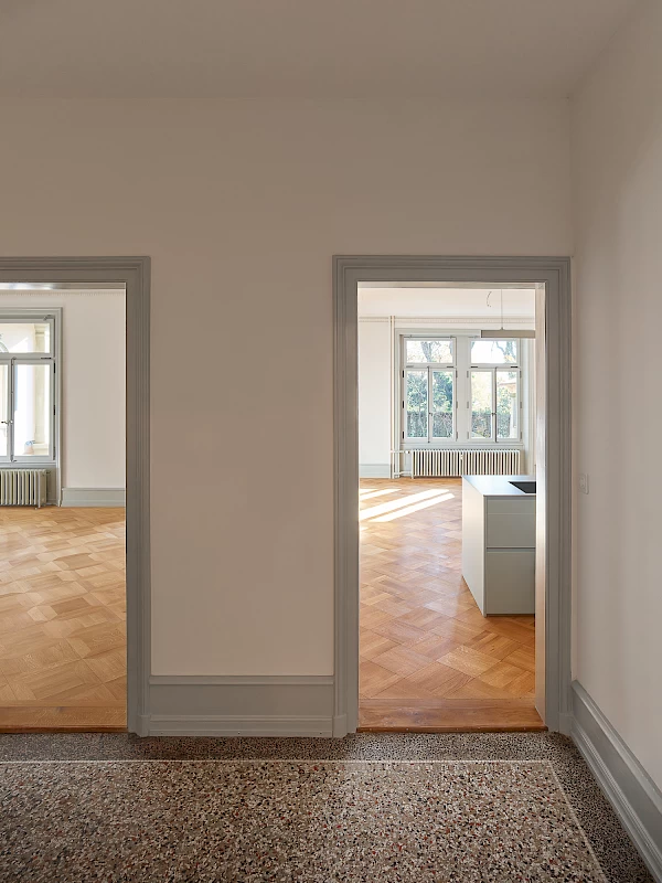 Im Zuge der Sanierung wurde das Haus in drei Wohnungen unterteilt. Die Hauptgeschosse erhielten eigenständige Zugänge, störende Einbauten wurden entfernt. Eine neu platzierte Küche im westlichen Hauptzimmer schafft einen zentralen Essraum mit Zugang zur Südterrasse. So entstand je eine 4-Zimmer-Wohnung pro Etage. Das früher als Mansarden genutzte Dachgeschoss wurde zu einer hellen Wohnung mit gartenseitiger Loggia ausgebaut, deren variable Verglasung an historische Vorfenster erinnert.