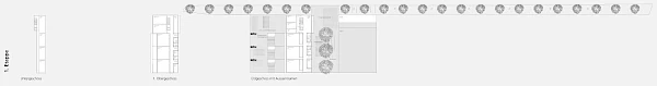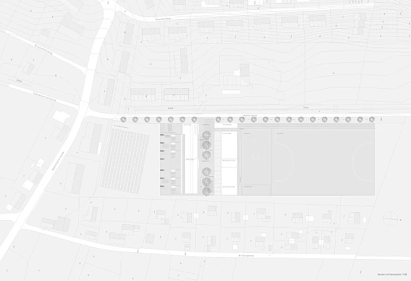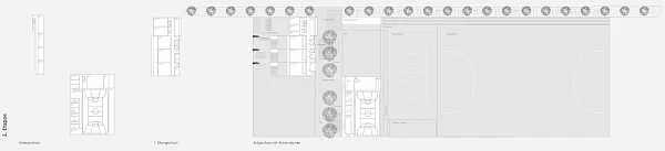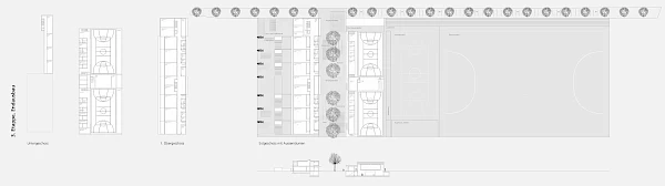 Alle Etappen werden vom Hof aus erschlossen und die inneren Verbindungen diesem entlang geführt, so dass der Aussenraum zum verbindenden Zentrum des Ganzen wird. Die Sporthallen liegen eingeschossig abgesenkt auf der Nordseite und sind auch blendfrei von Norden belichtet. Die Absenkung ermöglicht den Verzicht auf Pfählungen.