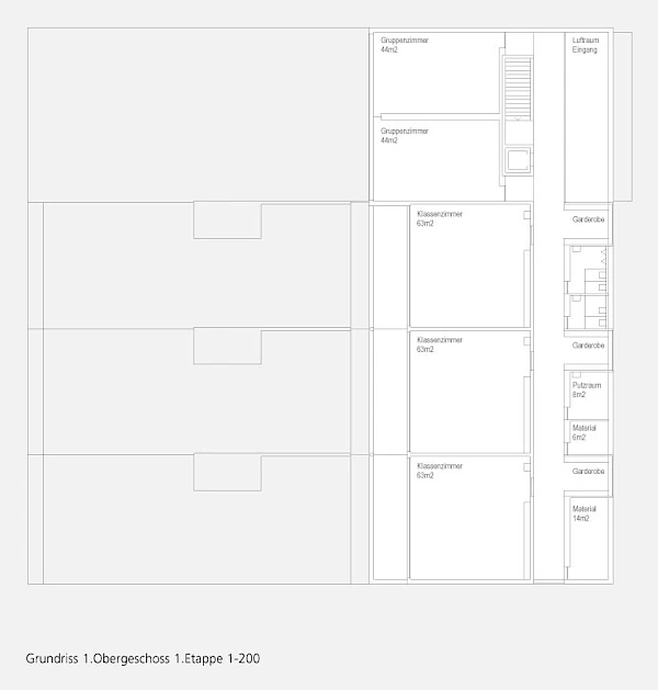Das additive Grundmuster gewährleistet eine hohe Wirtschaftlichkeit und eine optimale Ausgangslage für Veränderungen innerhalb einer gegebenen Primärstruktur. So kann ein Klassenzimmer in einer Folgeetappe neu konzipiert werden, ohne dass die Grundstruktur verändert werden muss.