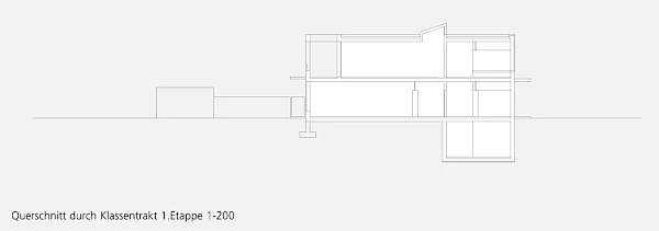 Die Kindergärten und Schulzimmer öffnen sich mitsamt ihren Aussenräumen nach Süden. Das Obergeschoss ist im Schnitt zurückversetzt, so dass Störungen zwischen Aktivitäten im Freien und den darüberliegenden Räumen vermieden werden.