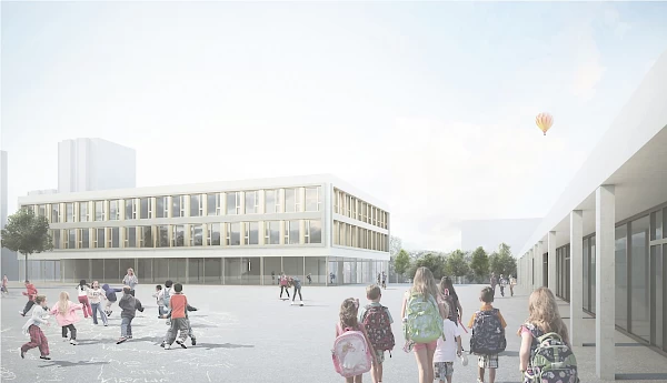 Durch die Neugliederung der Schulanlage mit Reduktion auf zwei Baukörper verbinden sich die heute getrennten Aussenräume zu einer durchgehenden Topographie. Es entstehen Plätze mit klarer Nutzungszuordnung die sich übergeordnet zum öffentlichen Begegnungsbereich des Quartiers Kleefeld verbinden. Die grosszügigen Anbindungen der Plätze an die Quartierstrassen unterstützen diese Absicht zusätzlich.