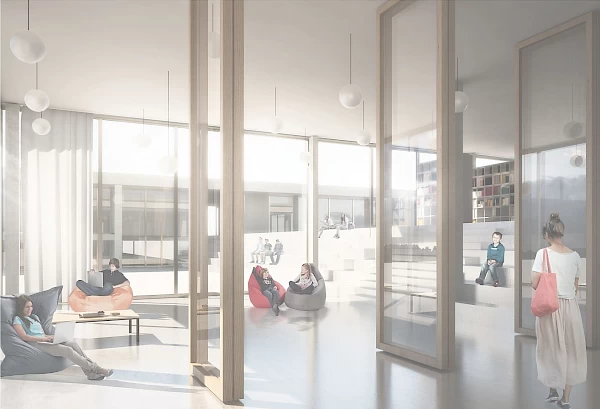 Mit der Aufteilung in zwei Baukörper erreicht das Projekt in einfachster Weise eine klare Zuordnung der Nutzungen. Basisstufen und Tagesschule profitieren von einem separaten Aussenraum im Osten und werden über diesen Stufengerecht einzeln erschlossen. Das Schulhaus mit den öffentlichen Räumen im offenen Erdgeschoss wird sowohl über den Pausen- wie auch über den Dorplatz erschlossen. Die gewählte Erschliessung ermöglicht auch einen unabhängigen oder kombinierten Betrieb der Räumlichkeiten für das Konservatorium.
